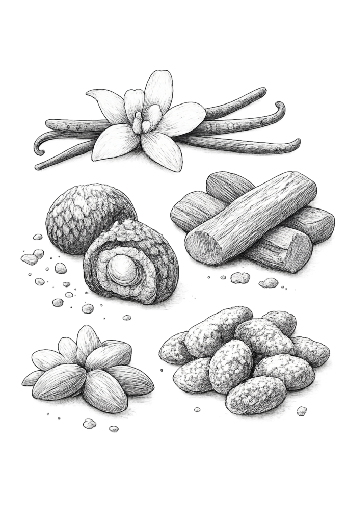 فانيليا، برالين، خشب الصندل، لوز مُسكّر